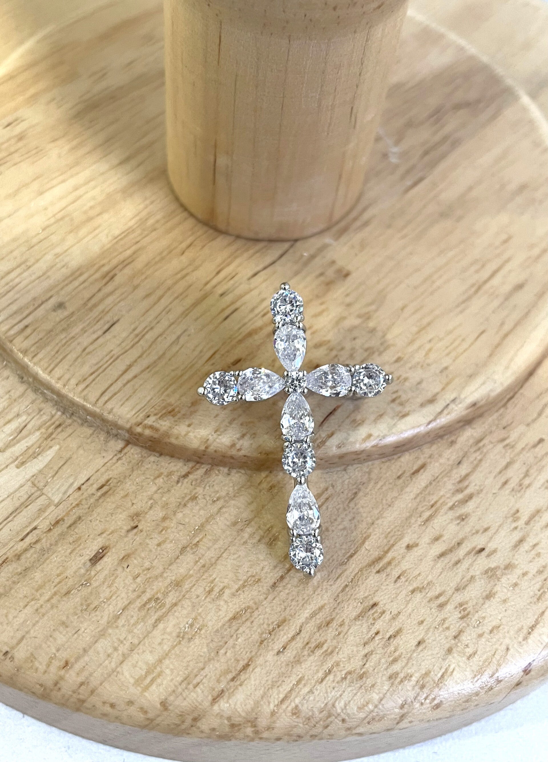 Each end of the crossbar and the length of the vertical bar are set with large, clear stones that capture light, adding a sparkling effect. The arrangement of the stones gives the cross a bold, structured look, making it a striking accessory.