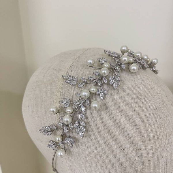This beautiful bridal headband combines the timeless elegance of large, lustrous pearls with the delicate sparkle of leaf-shaped crystals.