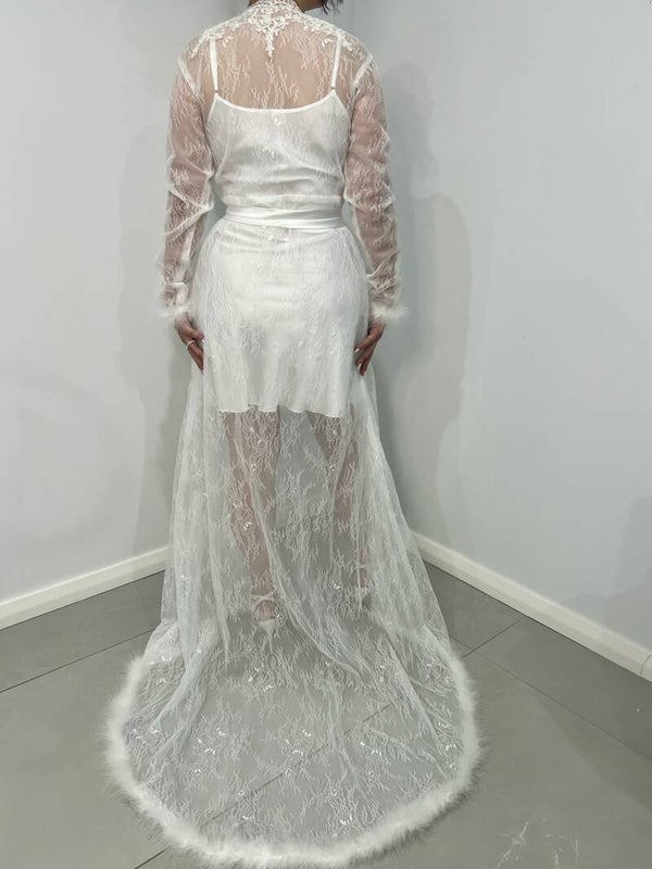 Crafted from delicate lace, it drapes beautifully and adds a touch of allure. The robe is finished with soft, fluffy accents on the hem and cuffs, creating a luxurious look that’s perfect for pre-wedding photos.