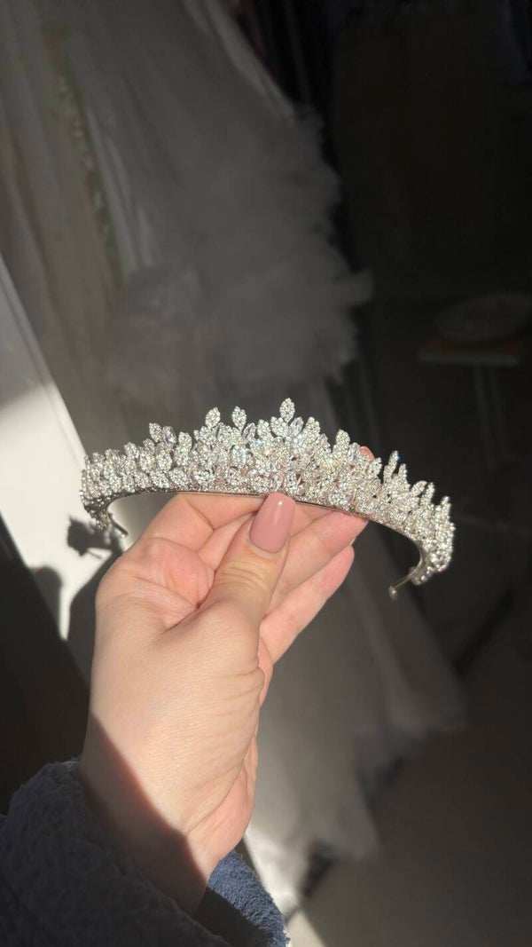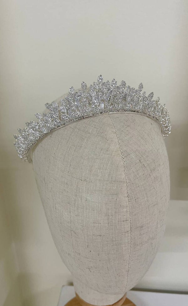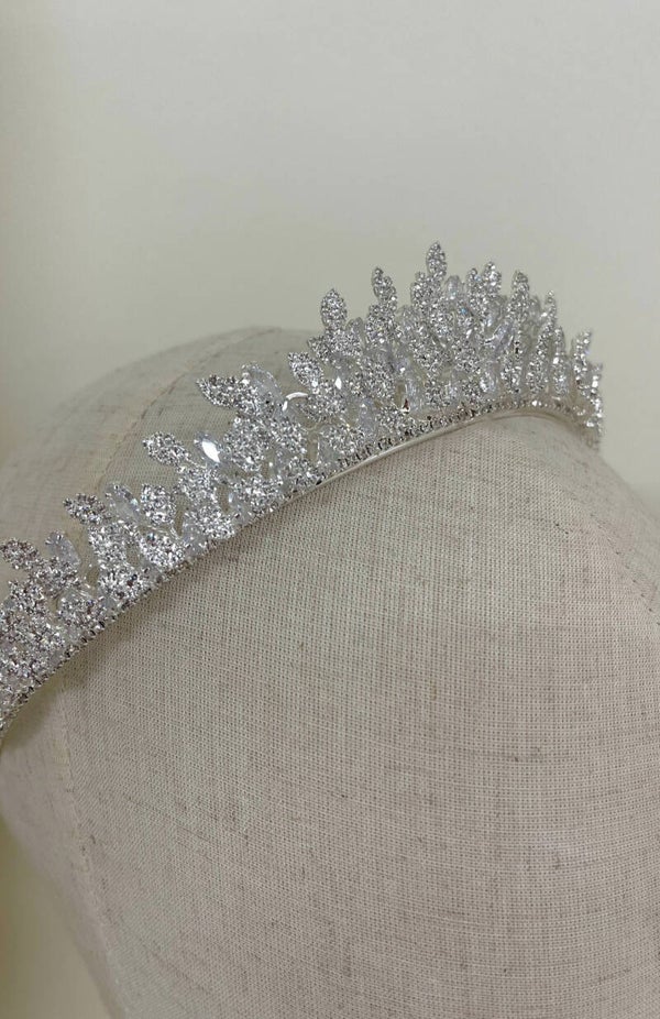 Rosa exudes elegance creating a sophisticated look, she is a delicate tiara adorned with crystal leaf motifs.