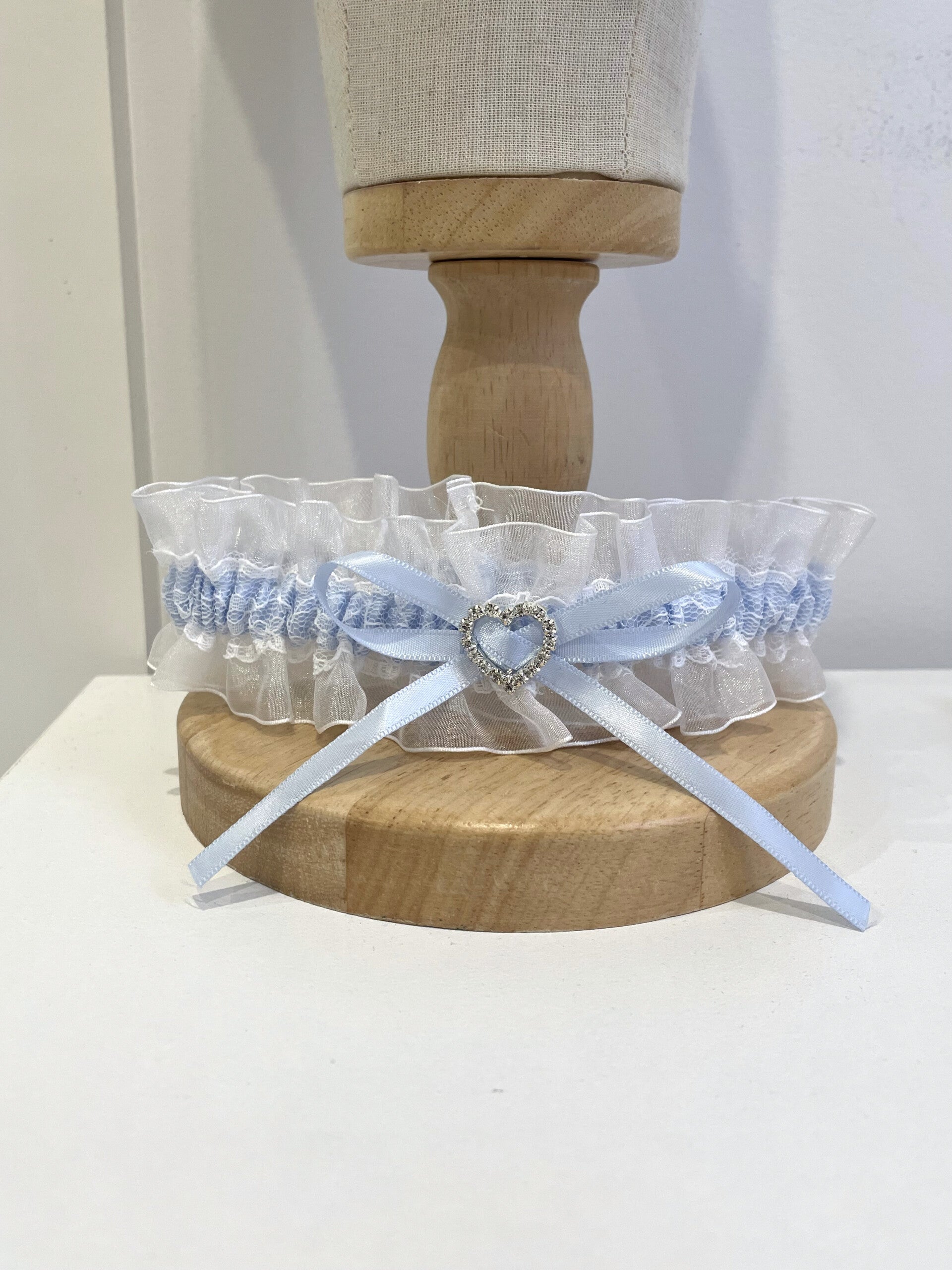 A light blue satin bow sits at the center, accented by a sparkling heart-shaped charm that adds a hint of glamour. With its airy, layered design and dainty details, this garter is a lovely choice for a bride’s special day.