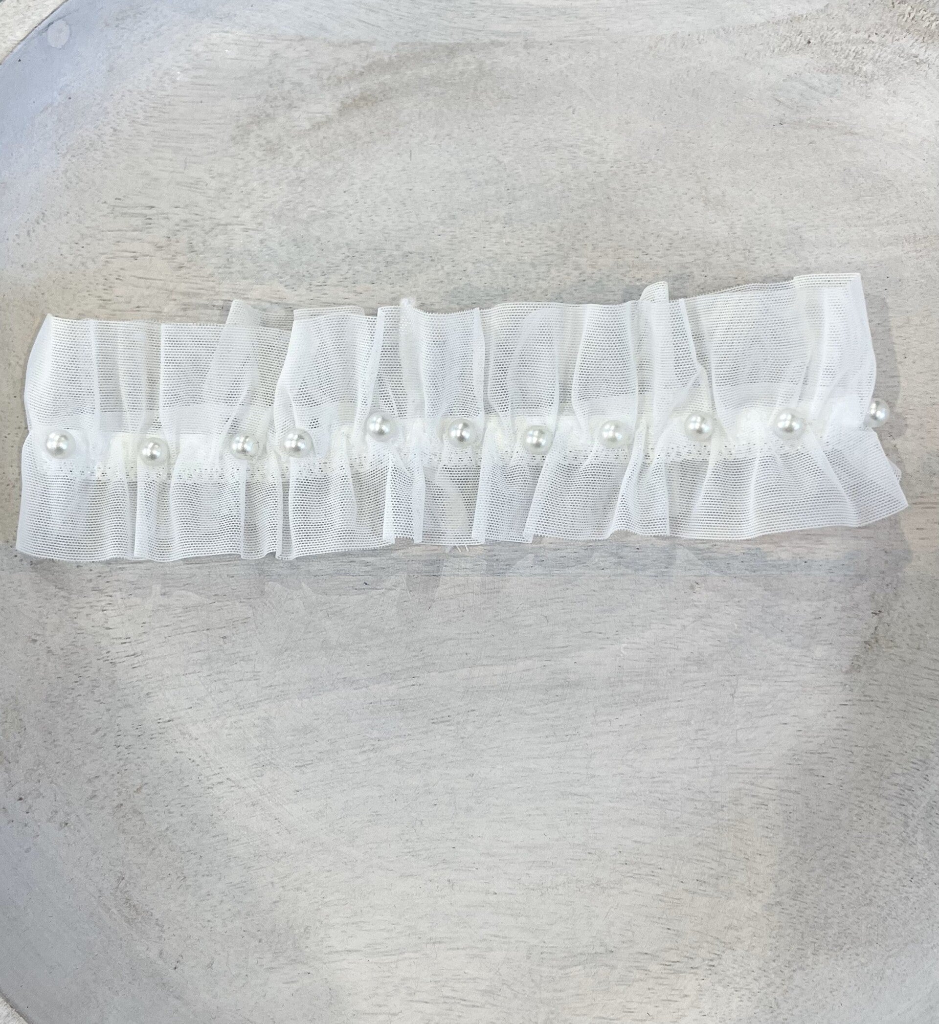 This bridal garter features soft, sheer fabric with delicate ruching, adorned with a row of classic pearls that add a touch of elegance.