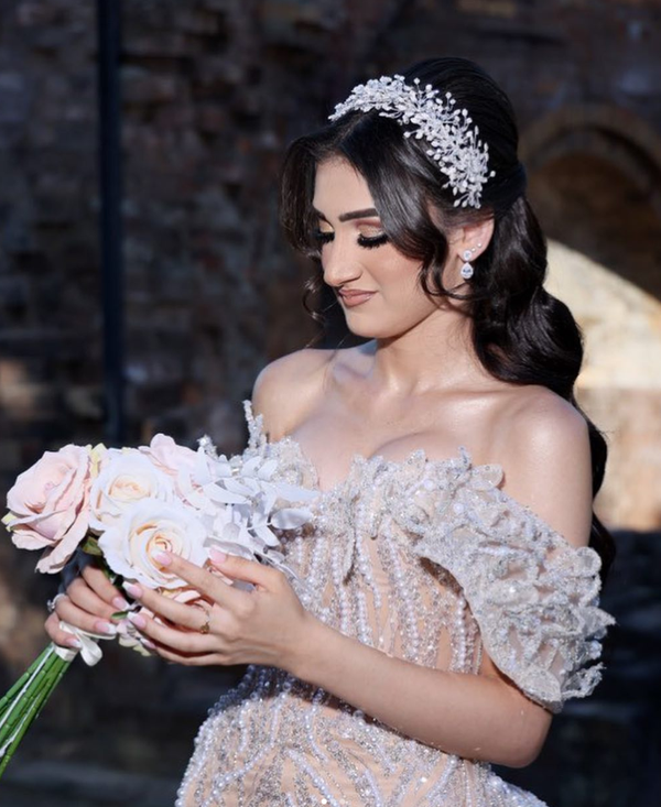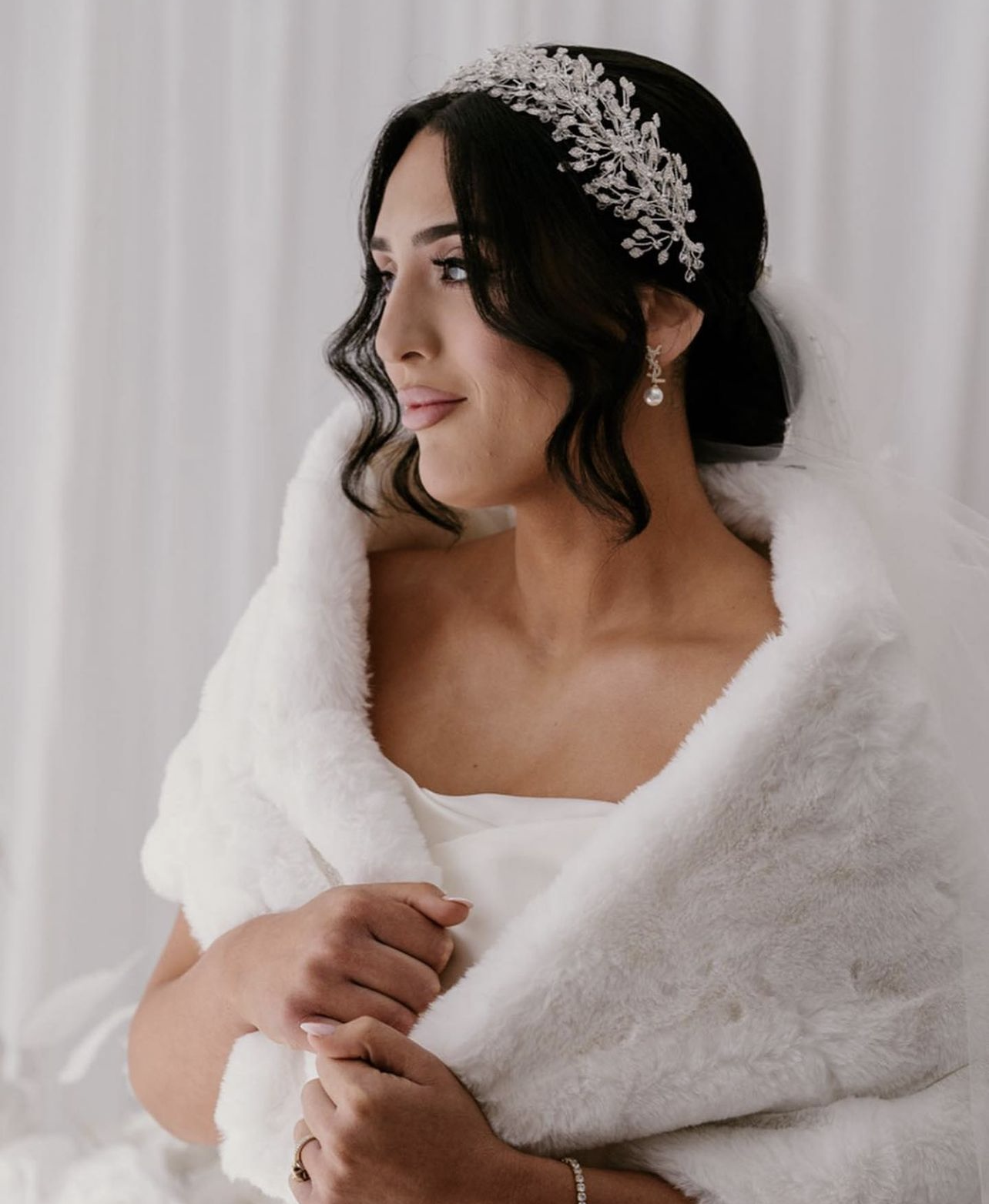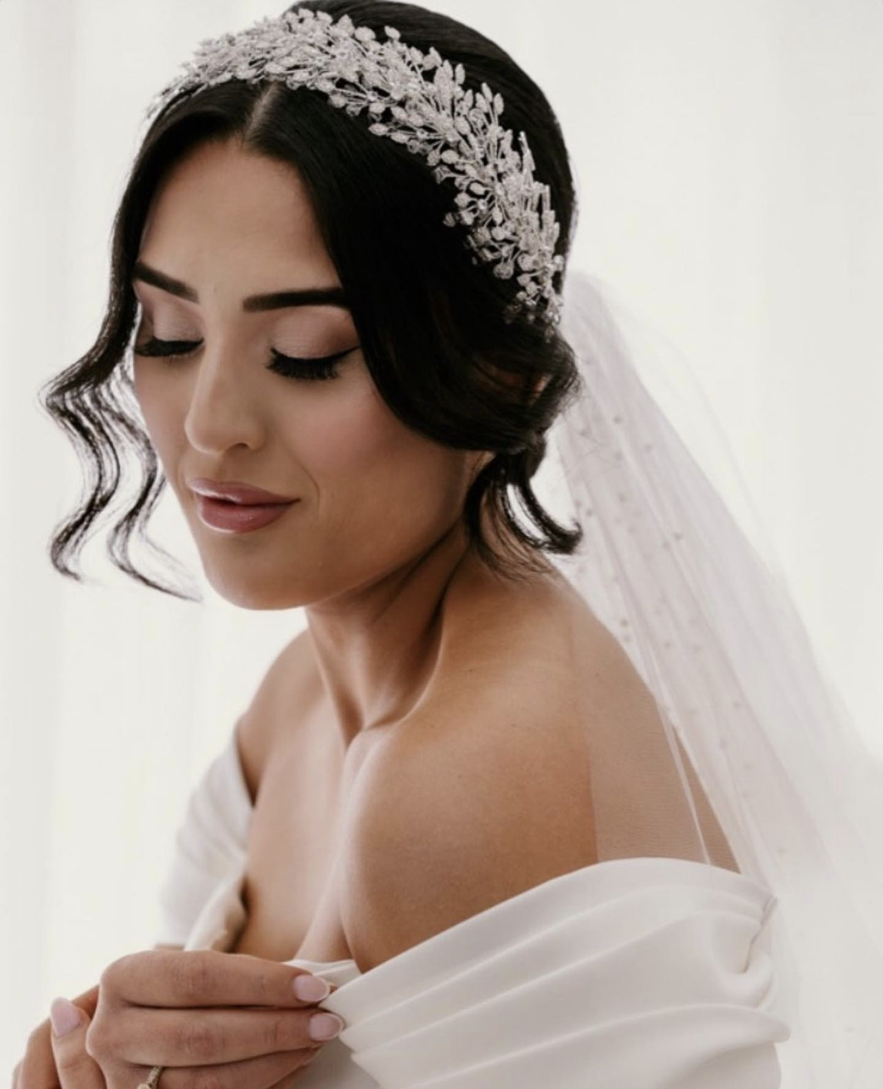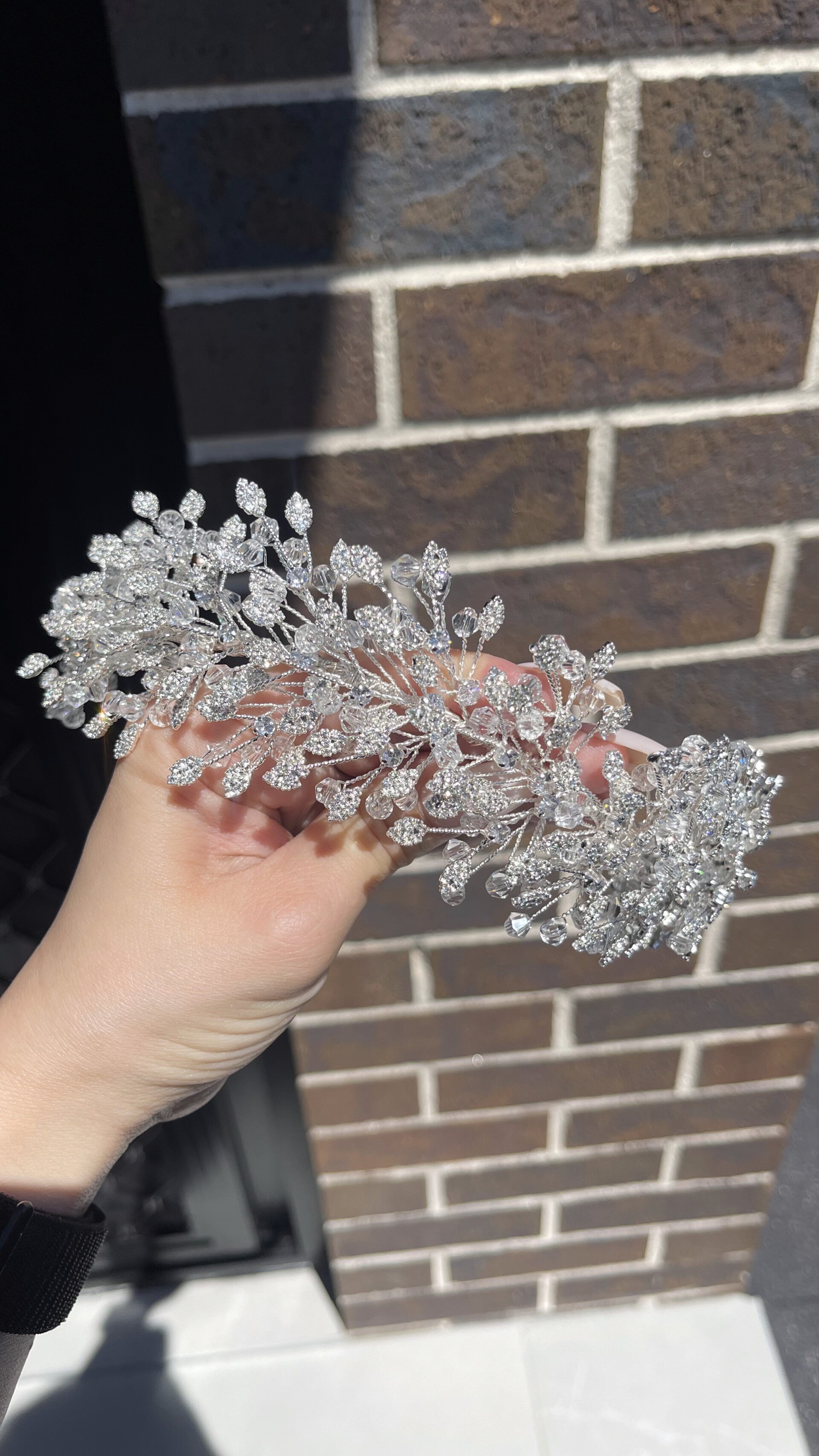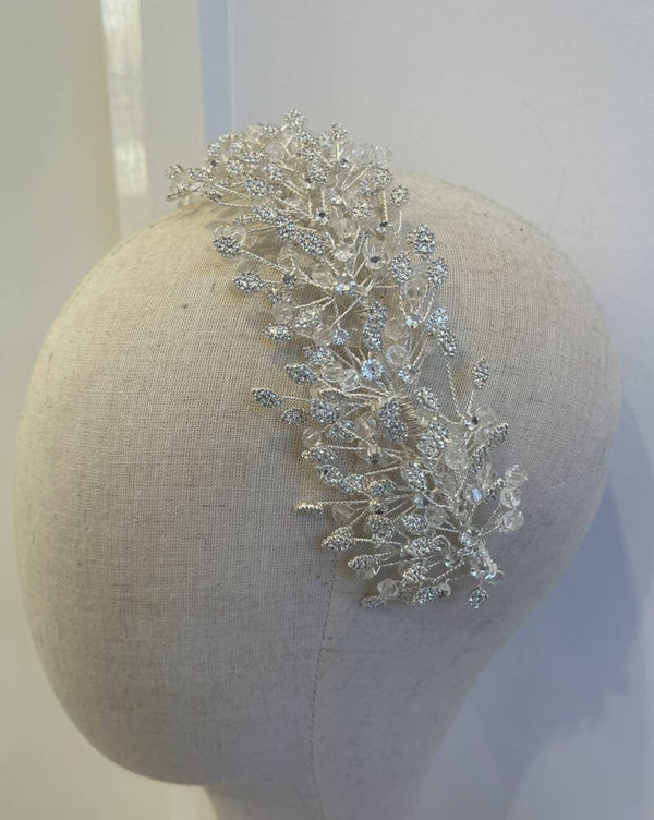 This bridal headpiece is a versatile accessory that can beautifully complement various hairstyles, from updos to loose waves or even sleek styles.