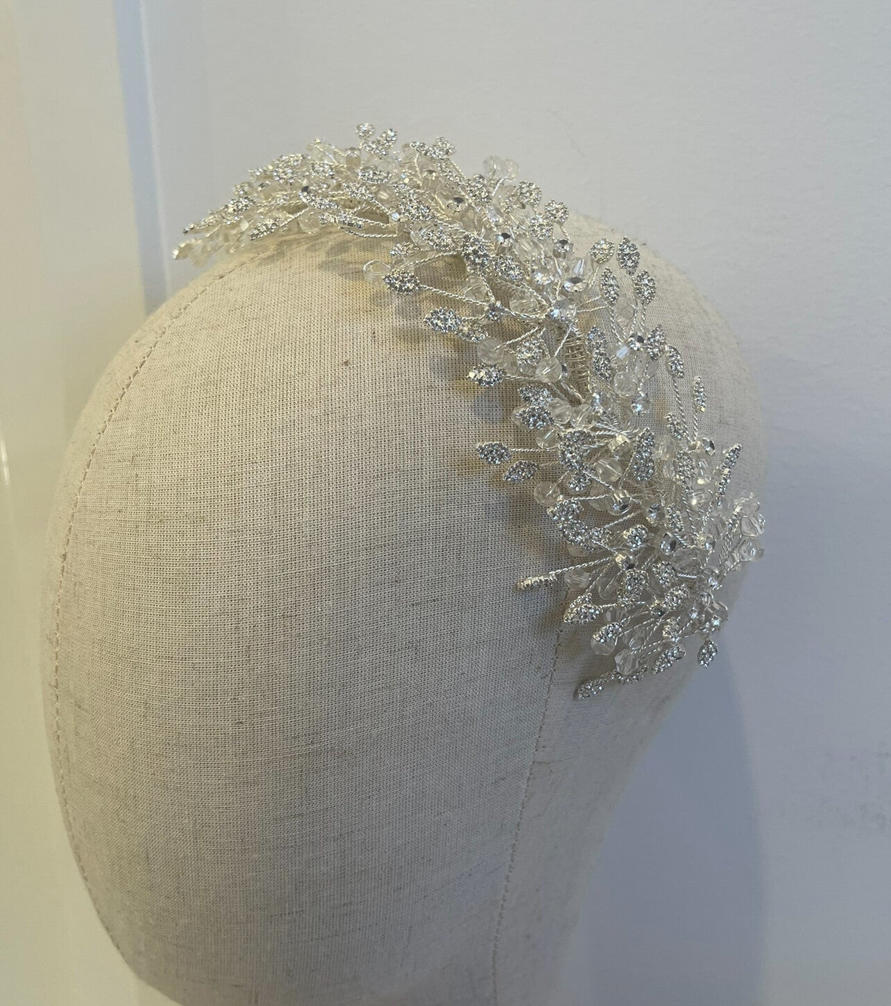 The intricate crystal details and delicate leaf embellishments with glass beads throughout add a timeless elegance, while the piece’s adaptability ensures it can be worn in a way that best suits the bride’s personal style and chosen hairstyle.