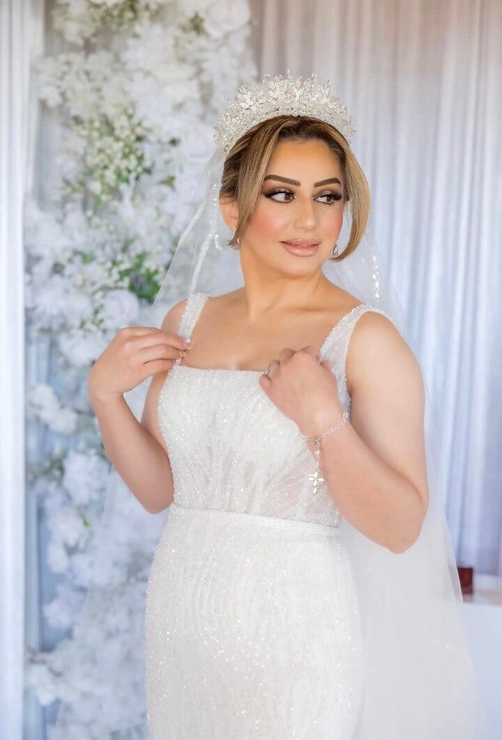 This exquisite bridal crown is a masterpiece of elegance and sophistication, designed to make any bride feel like royalty on her special day. The intricate detailing showcases a beautiful arrangement of shimmering crystals, creating a dazzling effect that catches the light from every angle.