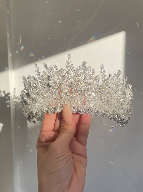 The crown features a delicate mix of pointed accents resembling icicles and rounded elements that mimic floral clusters, giving it a harmonious blend of modern and classic design.