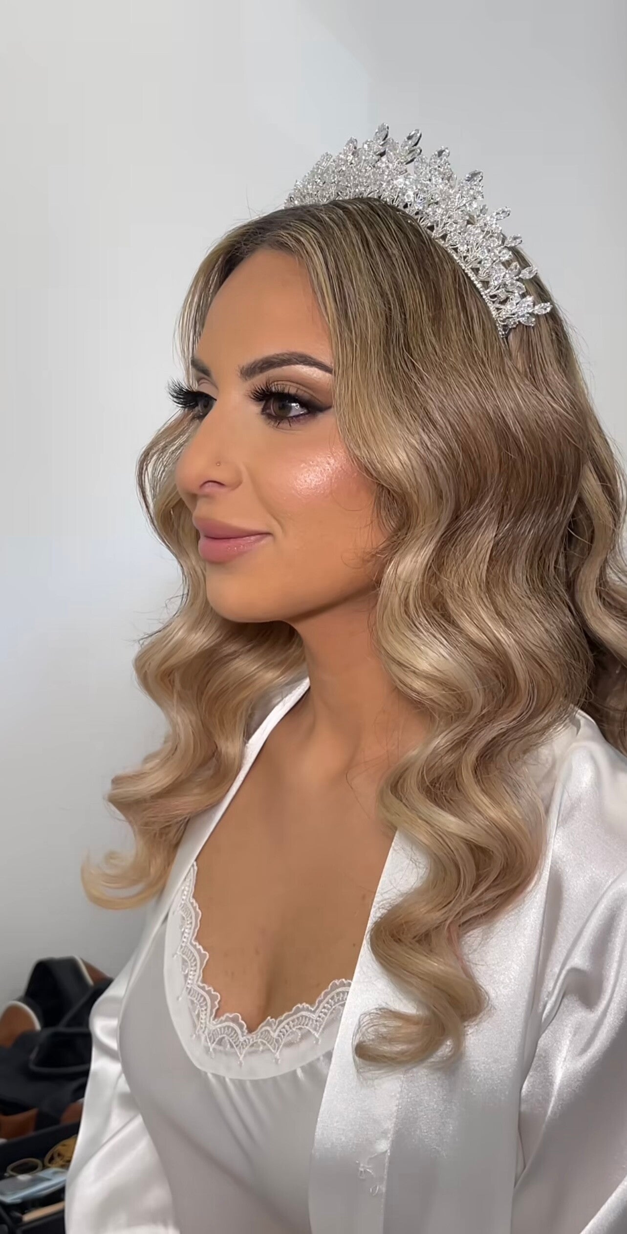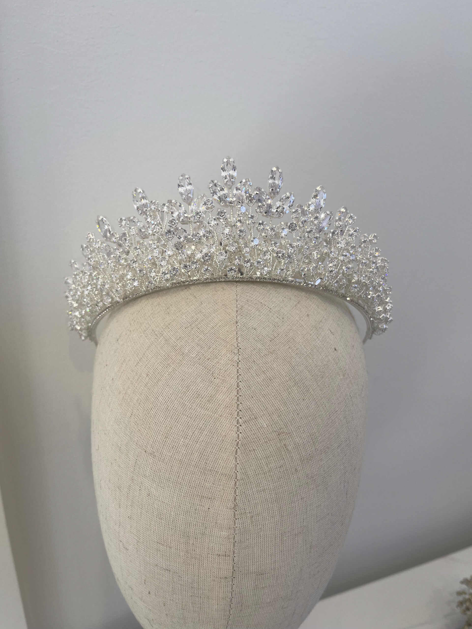 Its shimmering brilliance catches the light beautifully, making it an ideal choice for a bride who wants to add a touch of glamour to her wedding day look. The tiara's shape gently arches, complementing various hairstyles while maintaining a regal, timeless aesthetic.