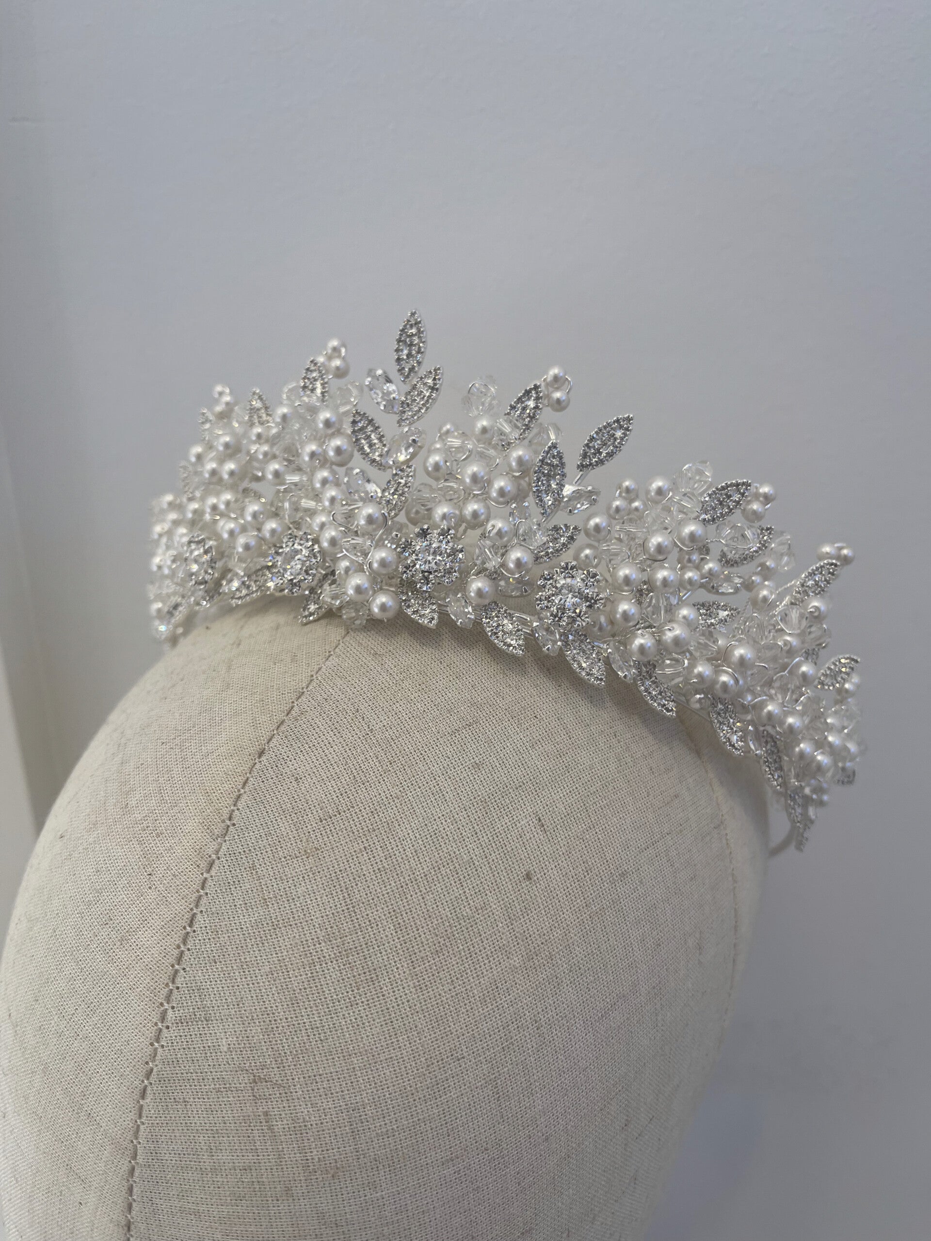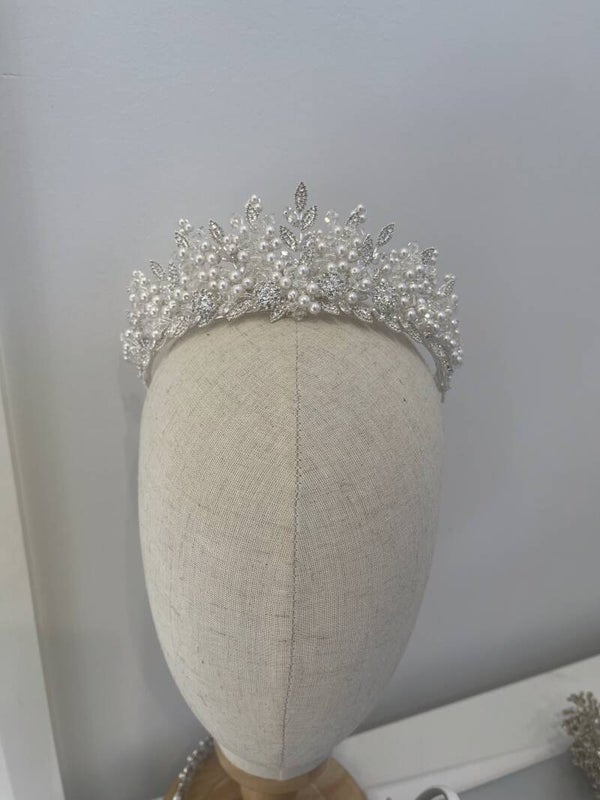 Harlow is a breathtaking masterpiece, blending classic beauty with modern elegance. Crafted with lustrous pearls nestled among glittering silver leaves and sparkling crystal accents, it captures the essence of timeless sophistication.