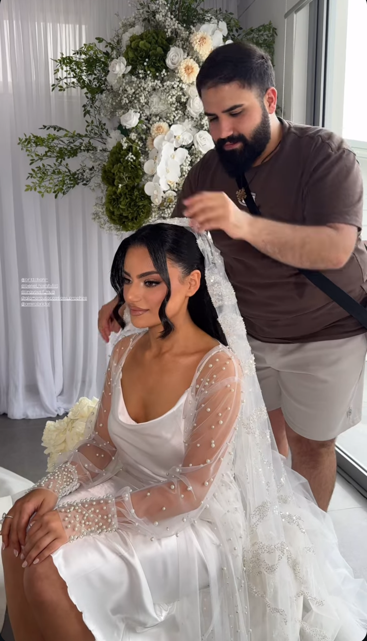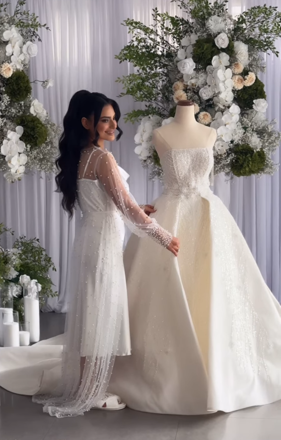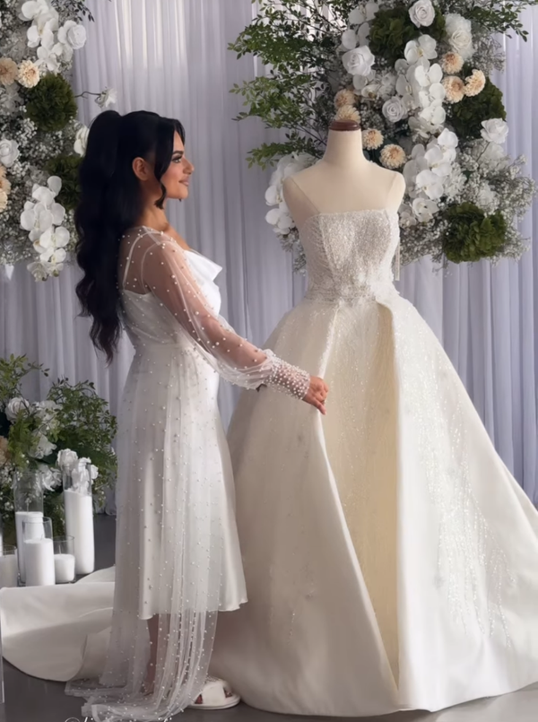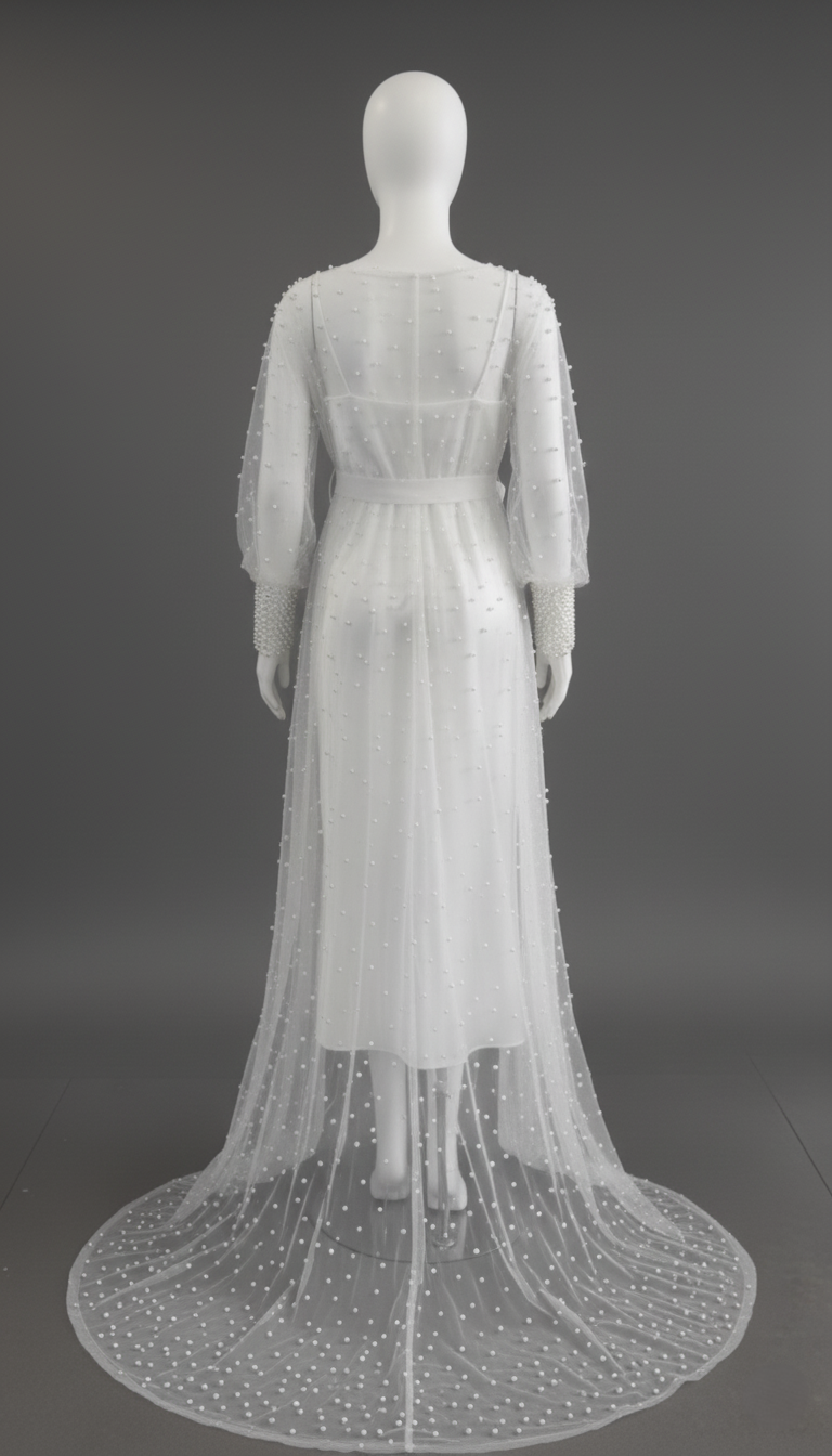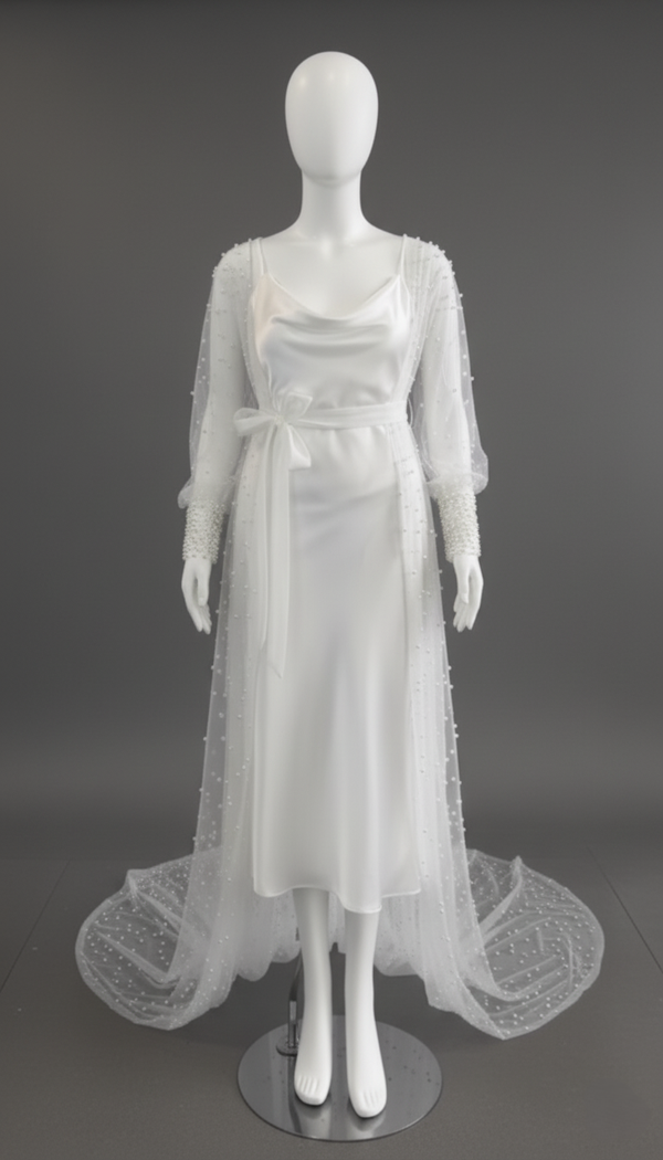 This exquisite tulle bridal robe is a masterpiece of elegance and charm. The sheer fabric is adorned with delicate pearl embellishments, lending a romantic and sophisticated touch.