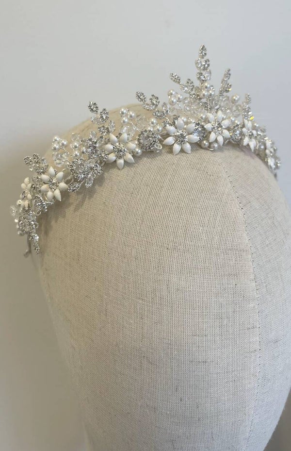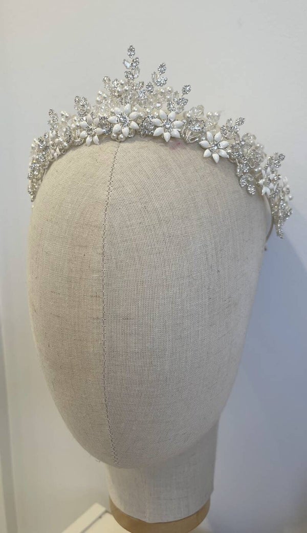 An enchanting bridal crown -- Alora is a vision of elegance, designed to make a statement on your special day. Featuring a harmonious blend of shimmering crystals, lustrous pearls, and delicate floral accents, this crown exudes timeless beauty.