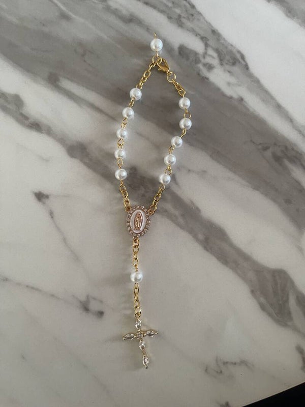 Add a touch of divine elegance to your special day with this exquisite bridal rosary bracelet. Featuring lustrous pearl beads, a radiant gold chain, and a delicate crystal-encrusted cross, this piece beautifully blends faith and sophistication. The centrepiece showcases a stunning medallion of the Virgin Mary, encircled by sparkling stones, symbolising love, protection, and blessings.