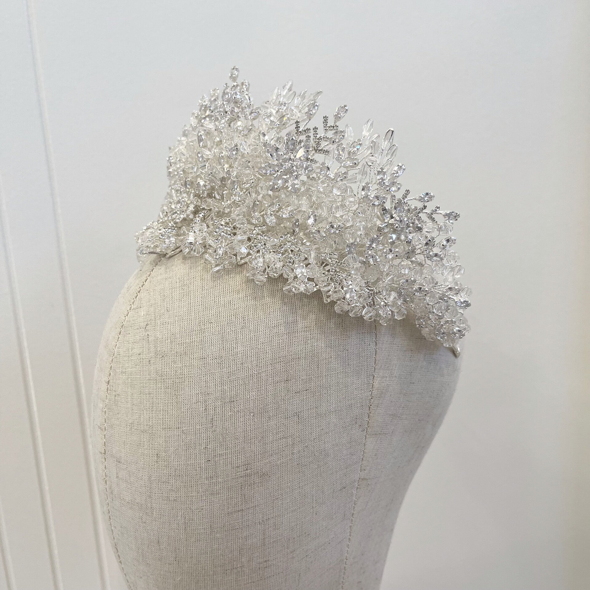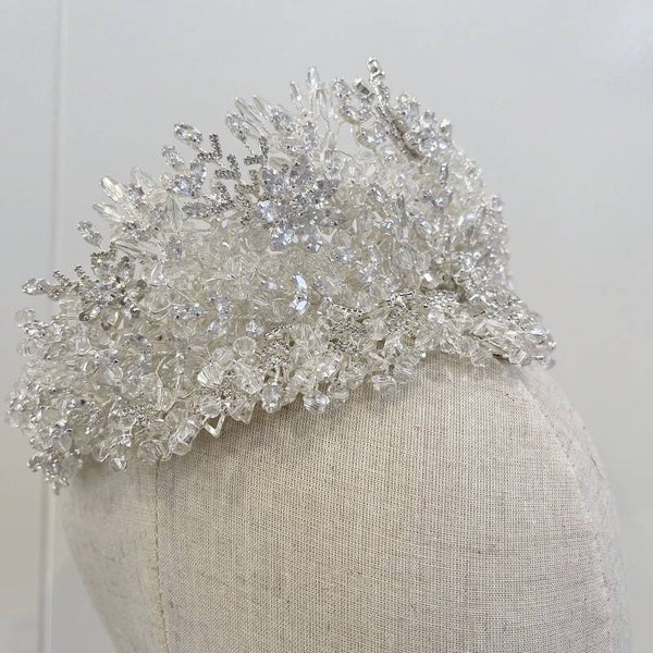 Inspired by the beauty of nature, its delicate branching design evokes the look of frost-kissed flowers or glistening dewdrops. Perfect for the modern bride who desires a touch of glamour, this crown adds a majestic finishing touch to any bridal look, whether paired with a sleek updo or flowing waves.