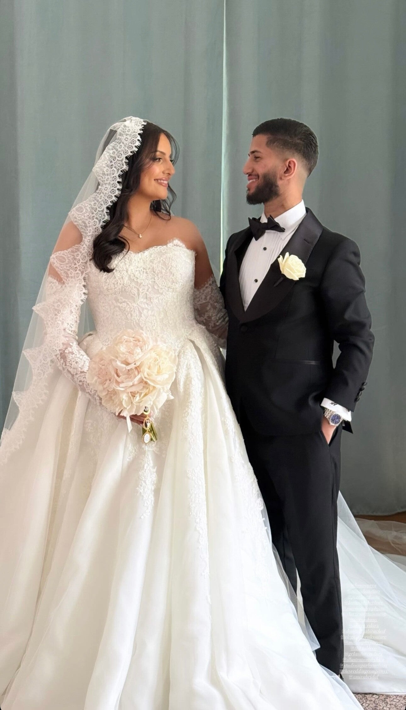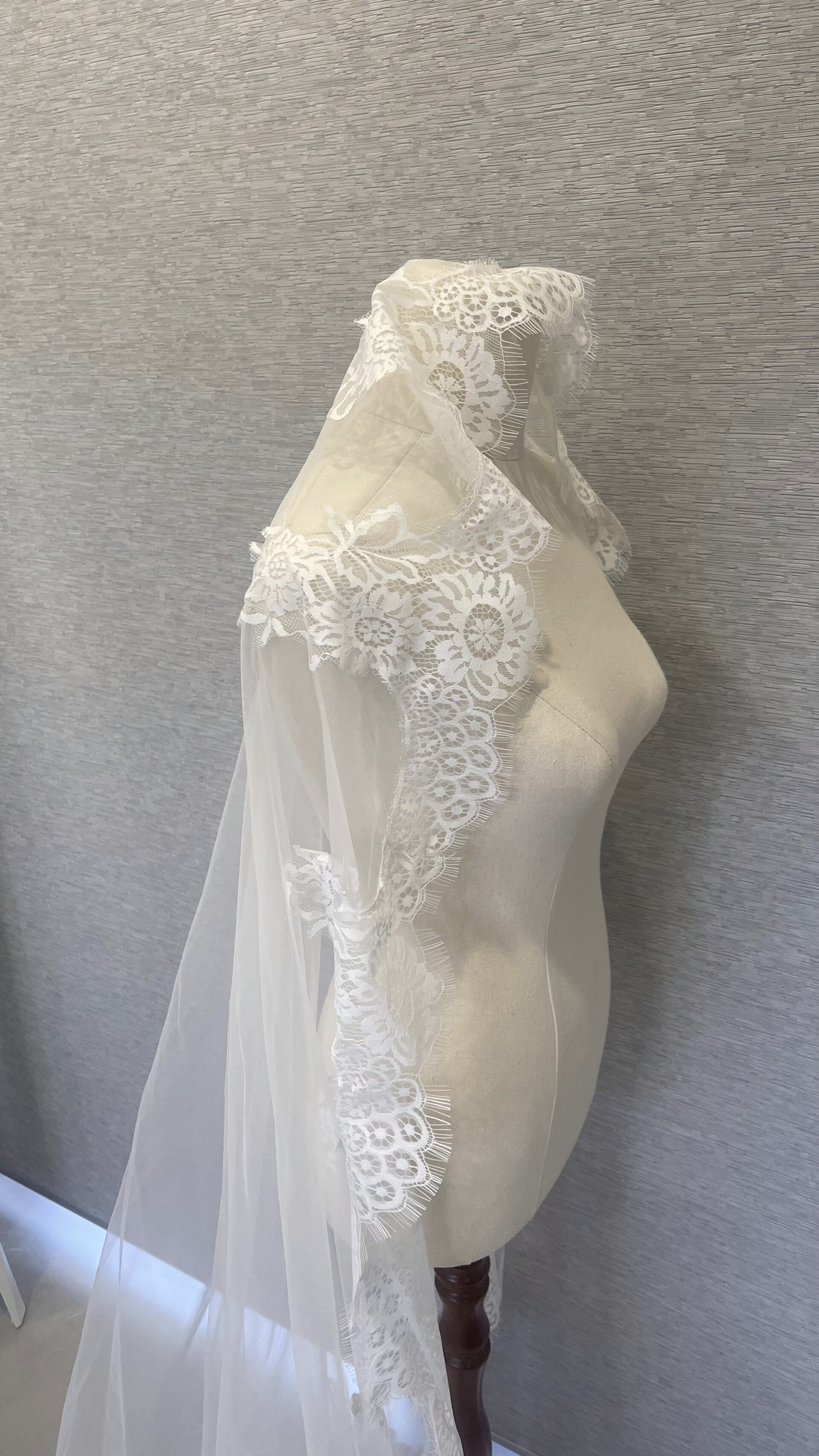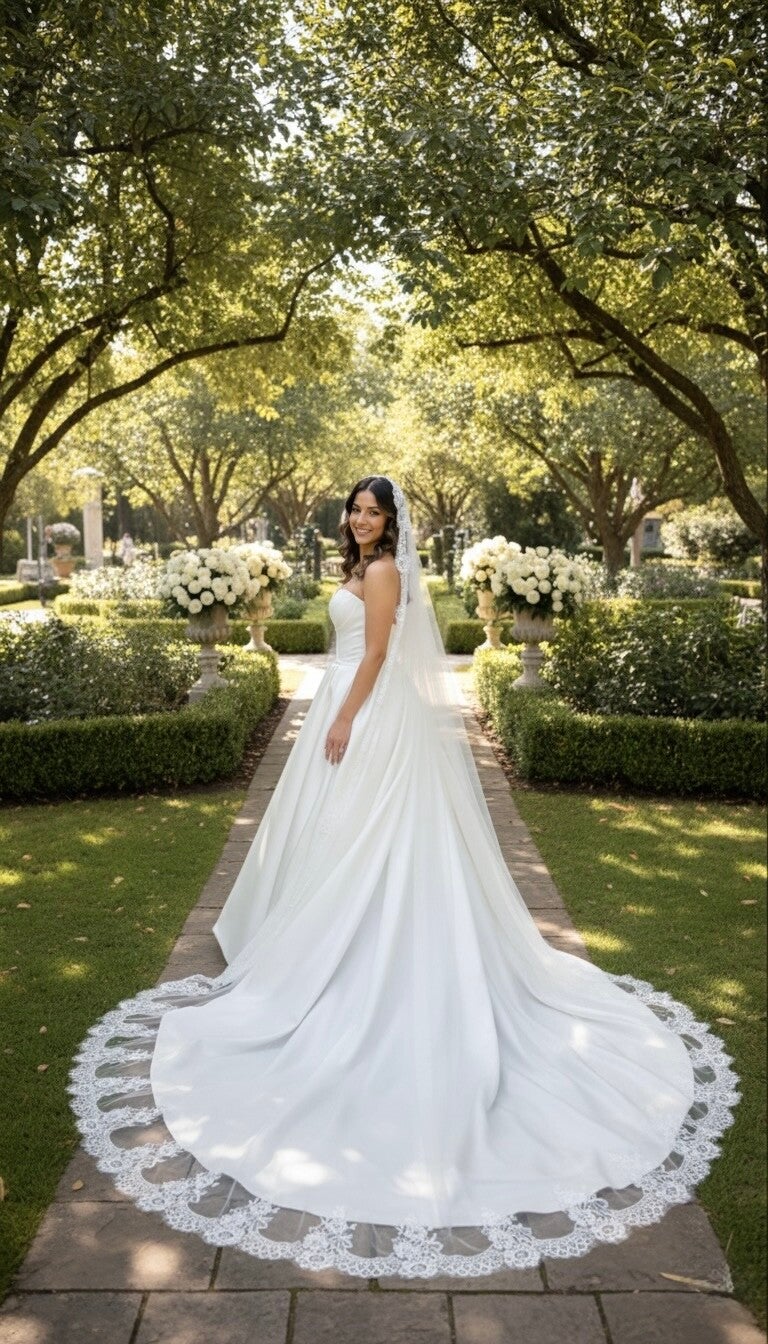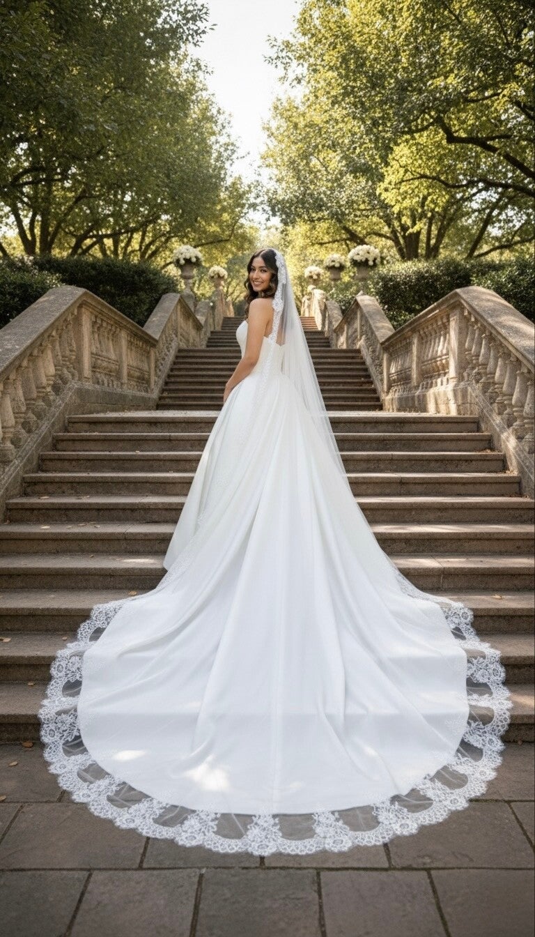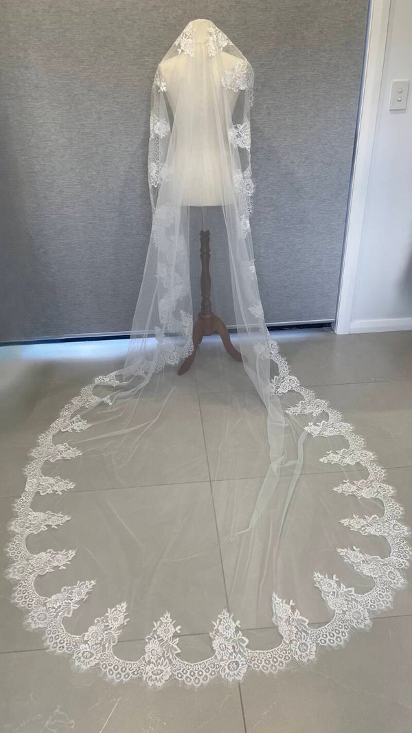 The delicate lace appliqué along the edges features intricate floral and scroll motifs, adding a touch of vintage charm and sophistication. Perfect for the bride seeking a classic, show-stopping veil that beautifully complements both traditional and modern gowns.