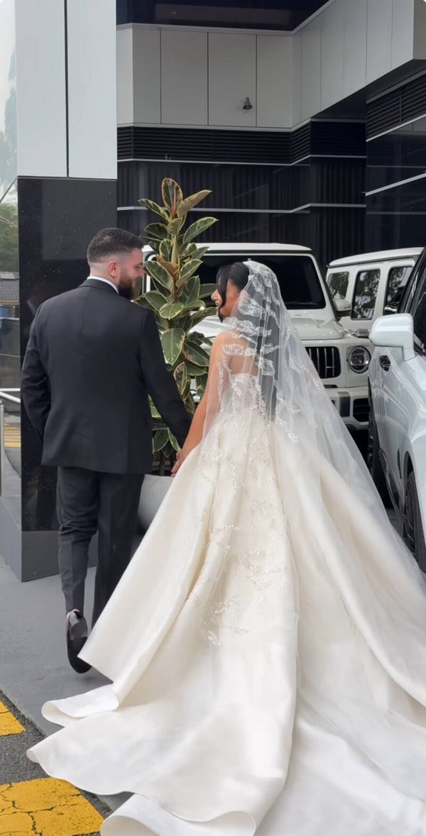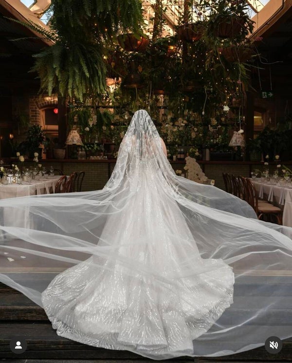 The intricate beadwork catches the light beautifully, adding a radiant sparkle with every movement. Made from soft, flowing tulle, this veil is a perfect blend of modern luxury and timeless elegance—ideal for the bride seeking a show-stopping accessory for her unforgettable day.