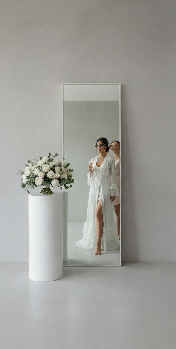 The Celene bridal robe is a perfect blend of lightness and elegance. The delicate fabric cascades softly, creating an ethereal look, while the ruffled sleeves and hem add a playful, feminine touch.