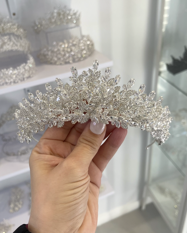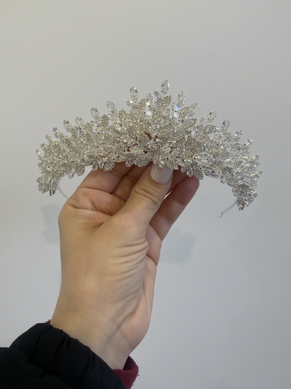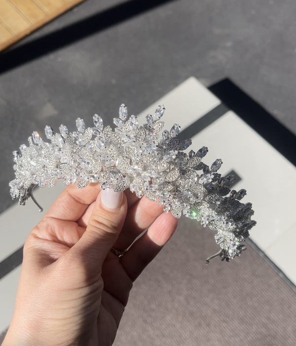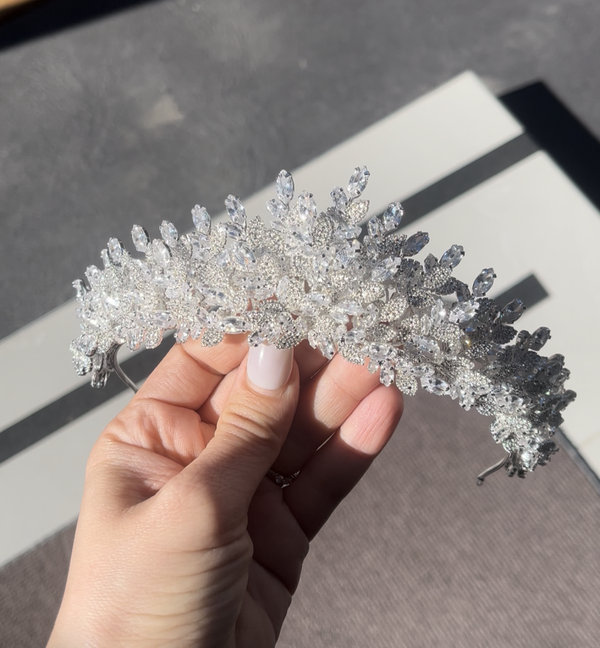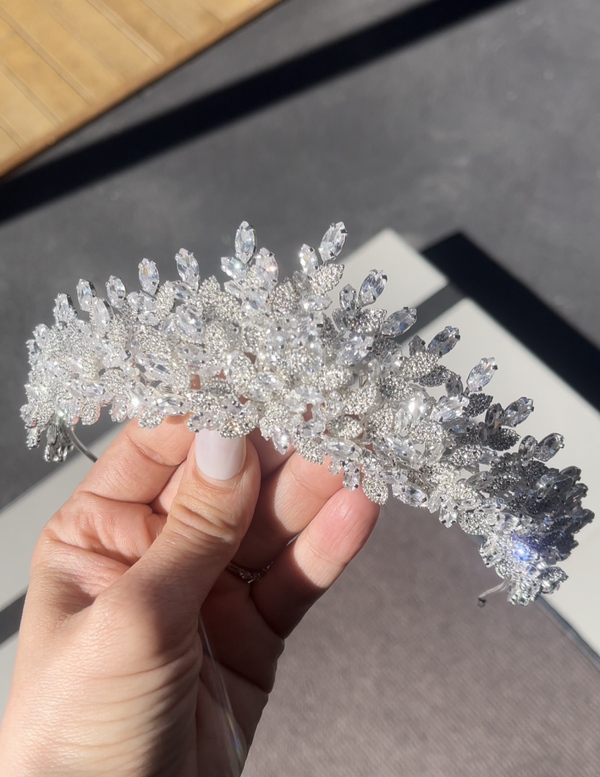 Whether worn with a classic veil or as a standalone accessory, this crown adds a regal, ethereal touch that complements any bridal ensemble.