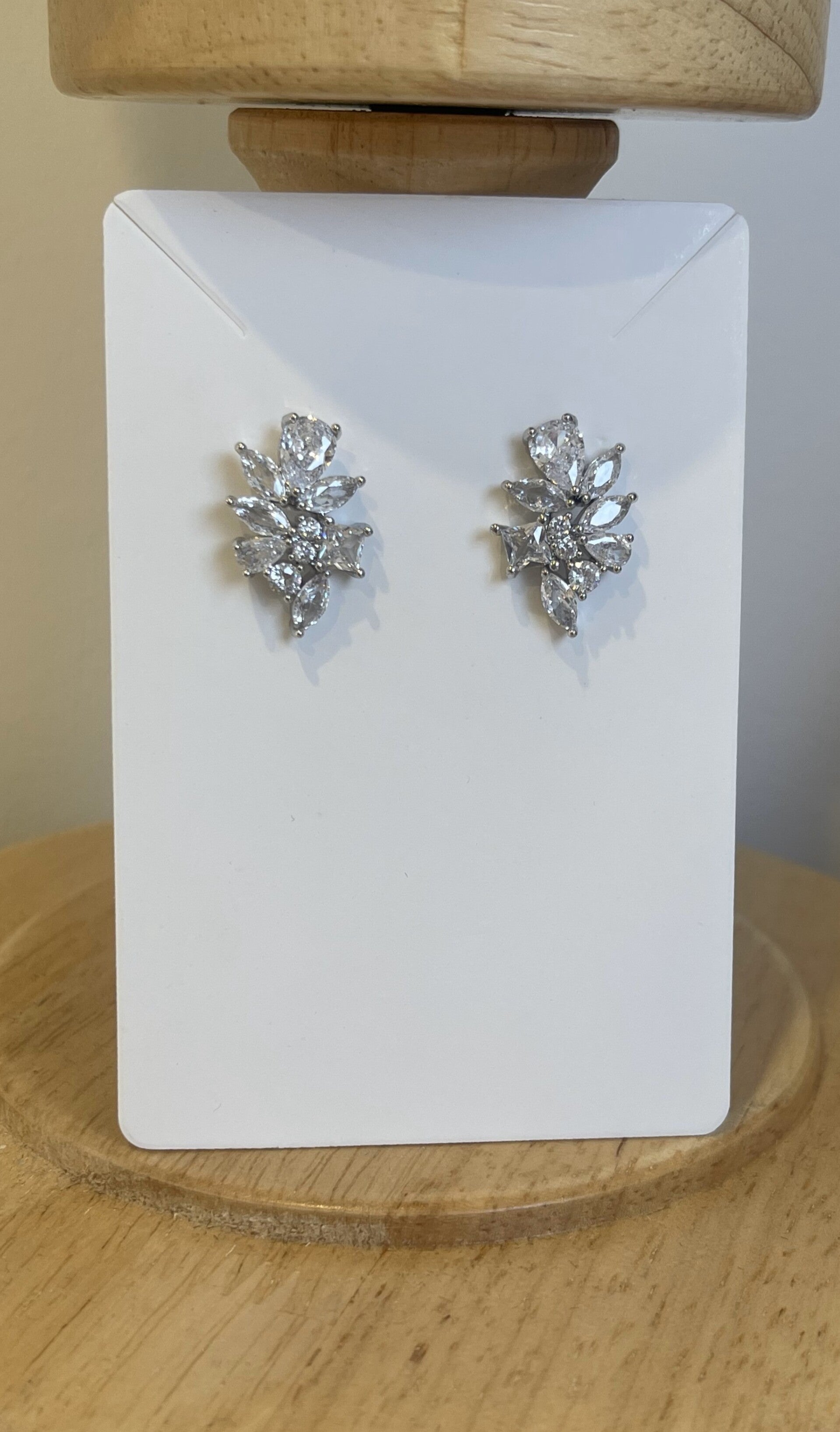 These dazzling bridal earrings offer a bold yet graceful statement, perfect for the modern bride. Crafted with an intricate cluster of marquise, round, and pear-cut stones, the design evokes a floral or leafy motif that sparkles from every angle.