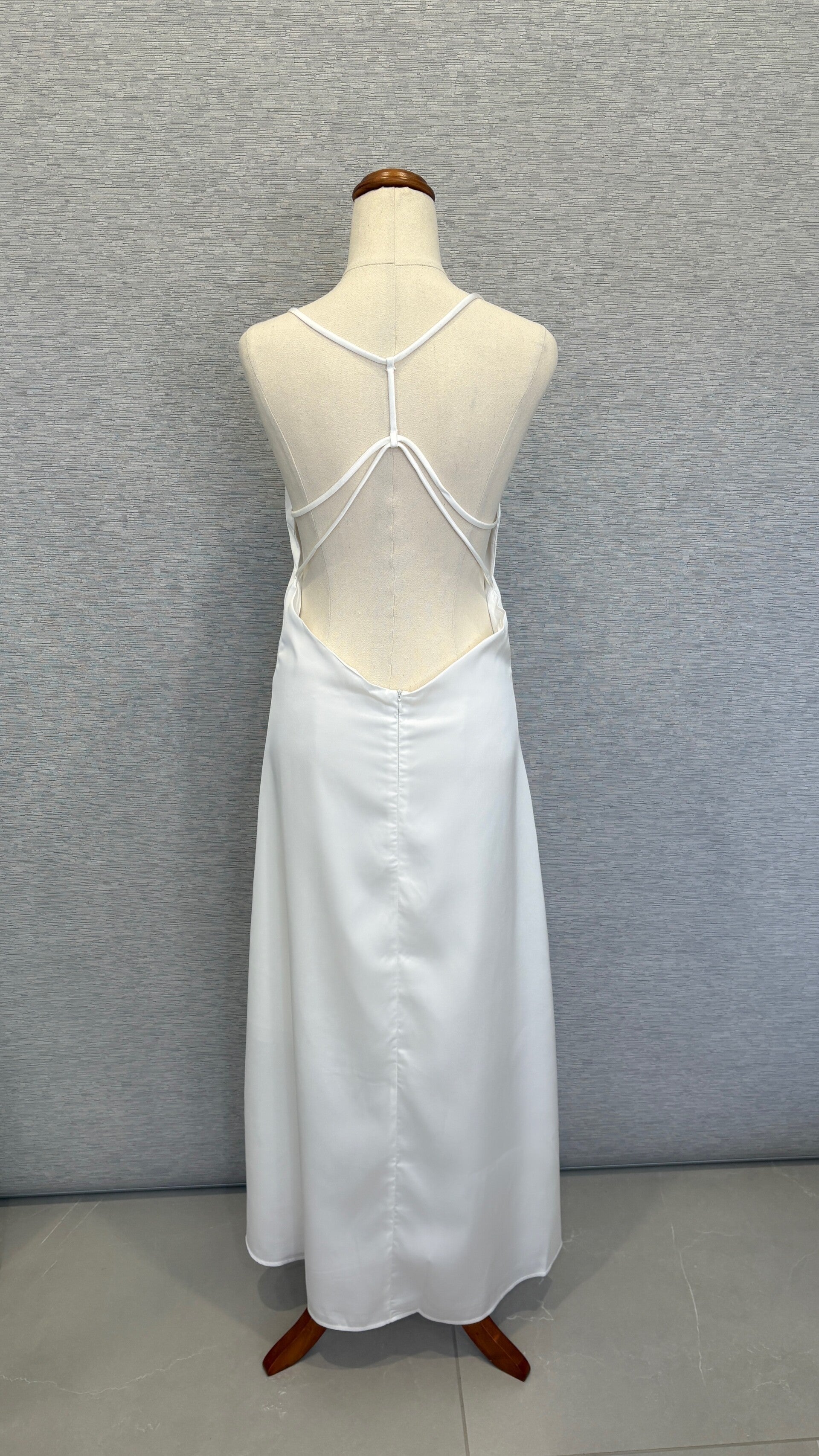 It features a flattering V-neckline and delicate spaghetti straps for a barely-there feel. The back showcases a stunning open design with soft, minimalist strap detailing which ideal for layering under sheer bridal robes or wearing while getting ready.