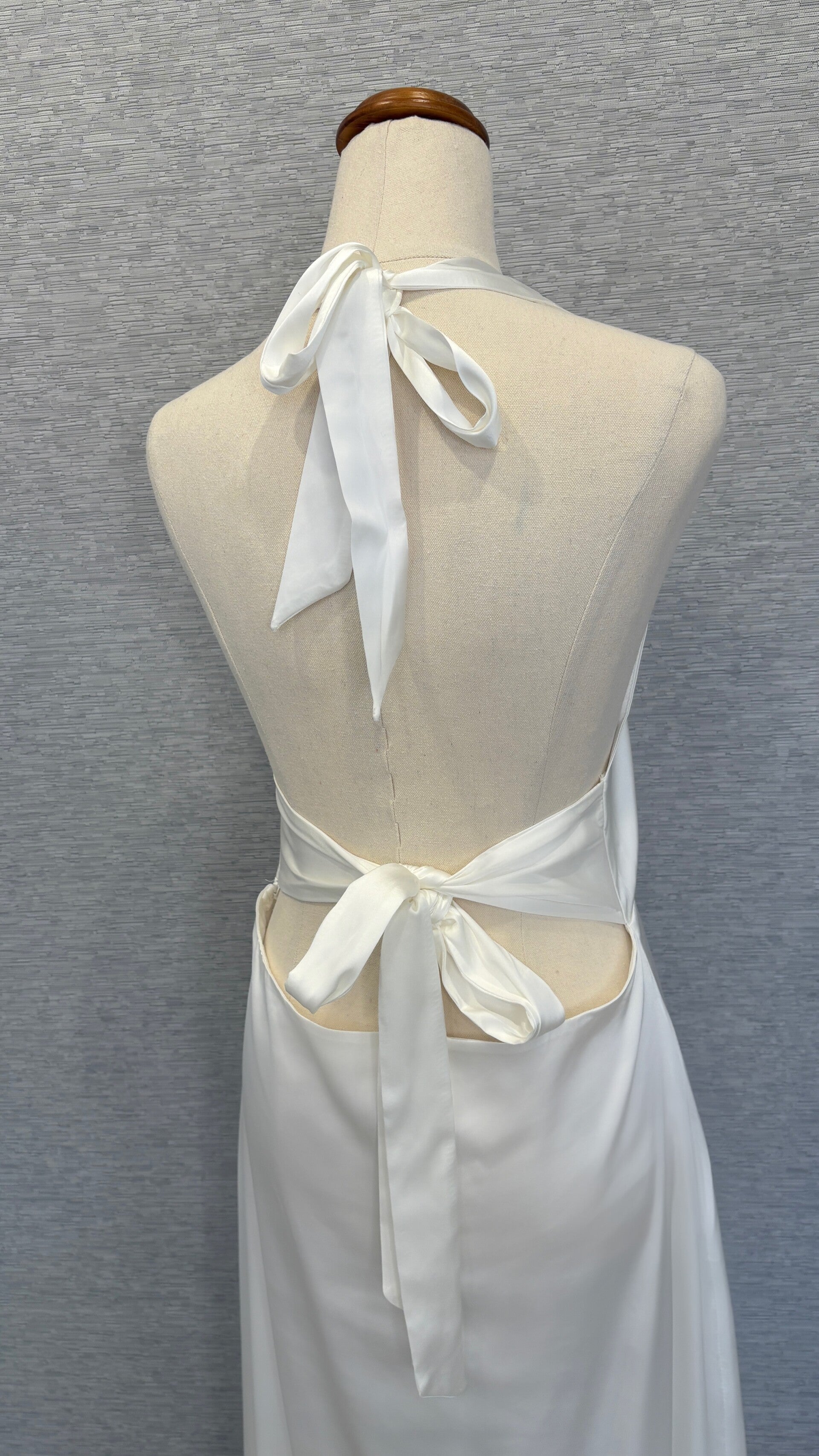 Noelle features a halter neckline that gracefully accentuates the shoulders and décolletage. The bodice is softly gathered at the bust for a gentle, flattering drape.