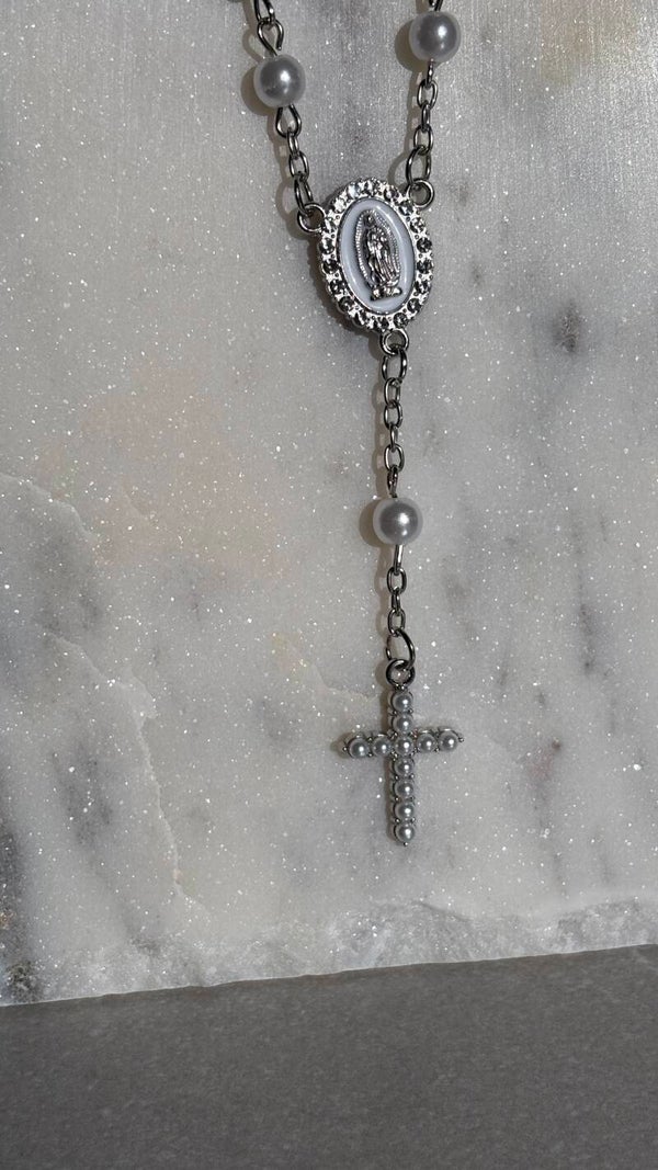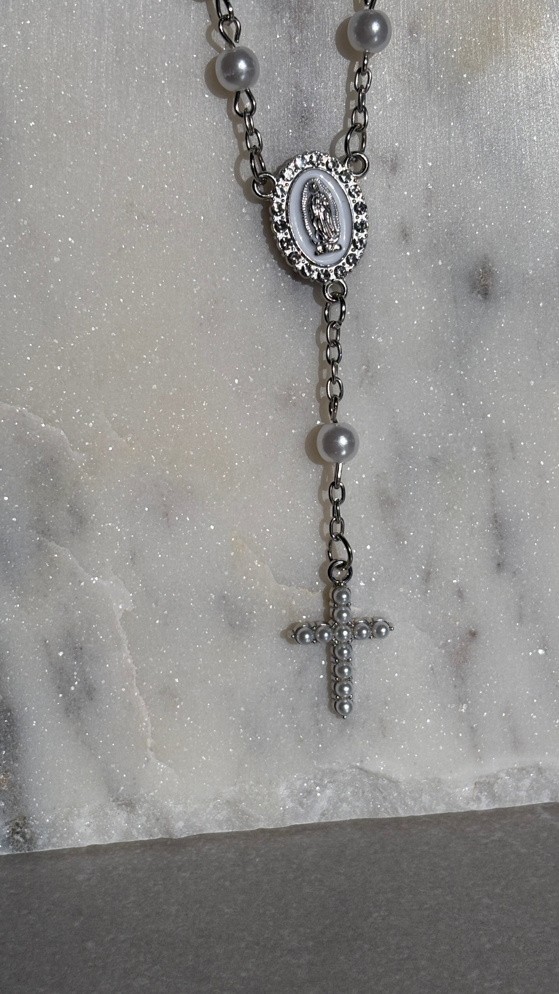 A delicate and meaningful piece, this bridal rosary bracelet is beautifully crafted with luminous pearls.