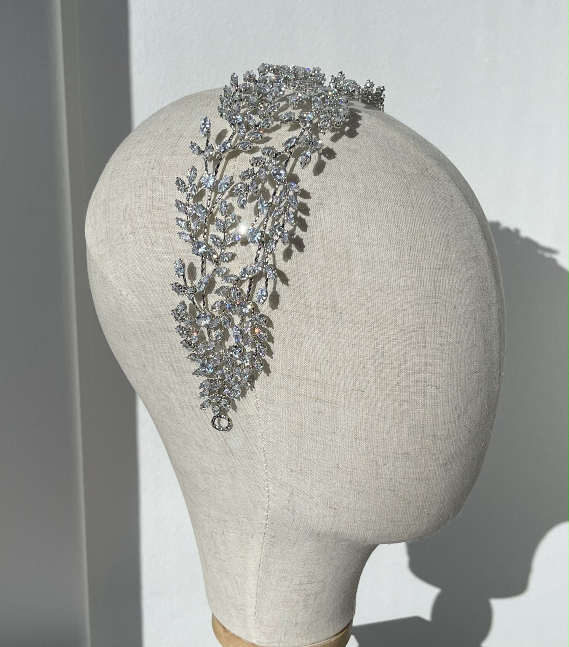 Delicate yet striking, the Athena flatpiece features an intricate vine-like design adorned with shimmering crystals that catch the light with every movement.