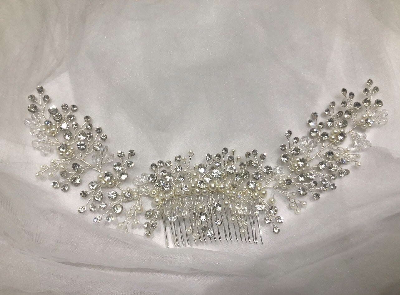 Intricately hand-wired, this luxurious hair comb features a delicate mix of dazzling rhinestone crystals and soft, luminous faux pearls in a rambling, botanical motif.