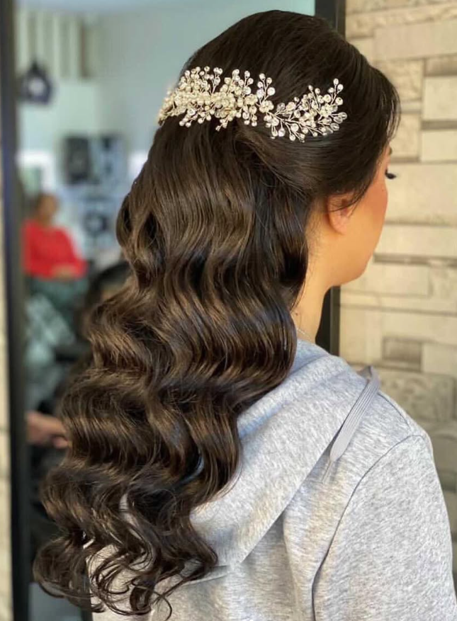 Its flexible shape and versatile comb backing allow it to be easily placed anywhere in an updo or half-up style. Perfectly balancing sparkle and softness, Eleanor is an exquisite choice to complete your look for both your wedding day or your engagement celebration.